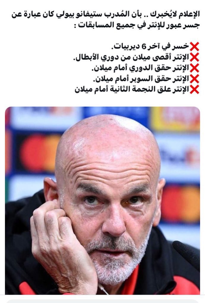 بالنهاية، أرى أن بيولي مناسب للنصر وظروف النصر مر بها مع ميلان - وصل لفريق يعاني - مهاجم بسن متقدم وادواره الفنية أصبحت اقل - جناح مزاجي متعجرف فائدته بدون الكرة صفر بيولي مع الميلان جرب كل الأفكار والخطط الممكنة وحظي بلاعبين من مختلف البروفايلات