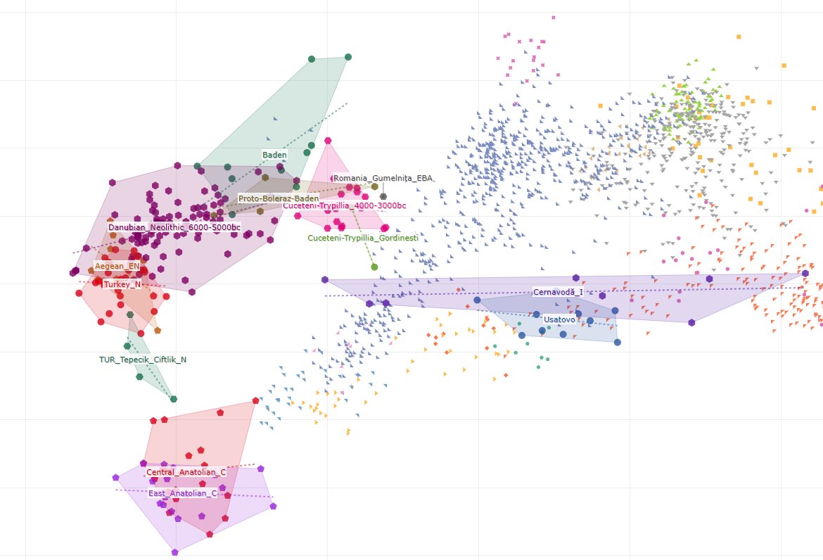 The Balkan cultures after that from 4000-3000 fall even further outside the Original Starcevo-LBK Neolithic cluster. Anatolia is pulled toward CHG and Cernavoda-Usatovo form a cline toward the steppe Especially interesting is most Baden samples falling a bit outside of Boleraz