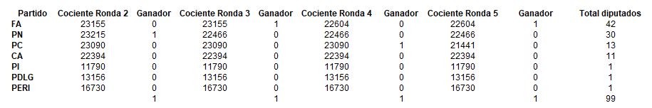 Este proceso se repite hasta completar los 99 diputados. En este cuadro pongo los resultados de las rodas siguientes: