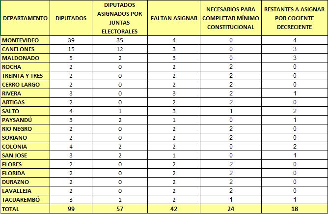 Ahora hay que poner esos diputados en los "casilleros" que corresponden a cada departamento. Es decir, ¿cuántos de esos 42 diputados del FA corresponden a Montevideo? ¿Cuántos de los 30 del P. Nacional son de Canelones?. Vamos.