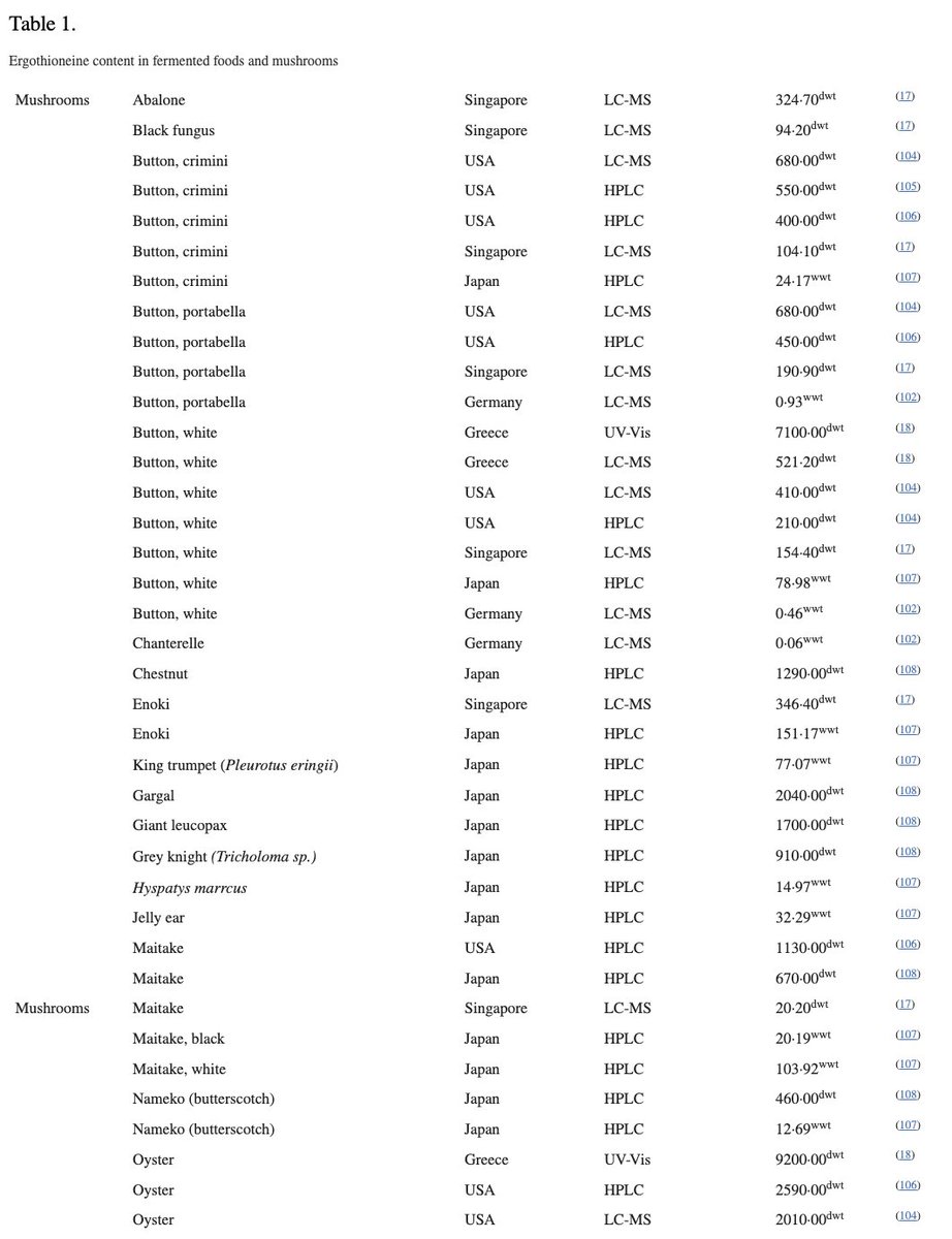 TYPES / AMOUNTS OF MUSHROOMS: The amounts of ergothioneine in mushrooms vary quite substantially, but it is present in all mushrooms. đ“‹Ľ Oyster mushrooms are the most concentrated đ“‹Ľ Shiitake seem to be next đ“‹Ľ White button has plenty + estrogen lowering compounds. You really