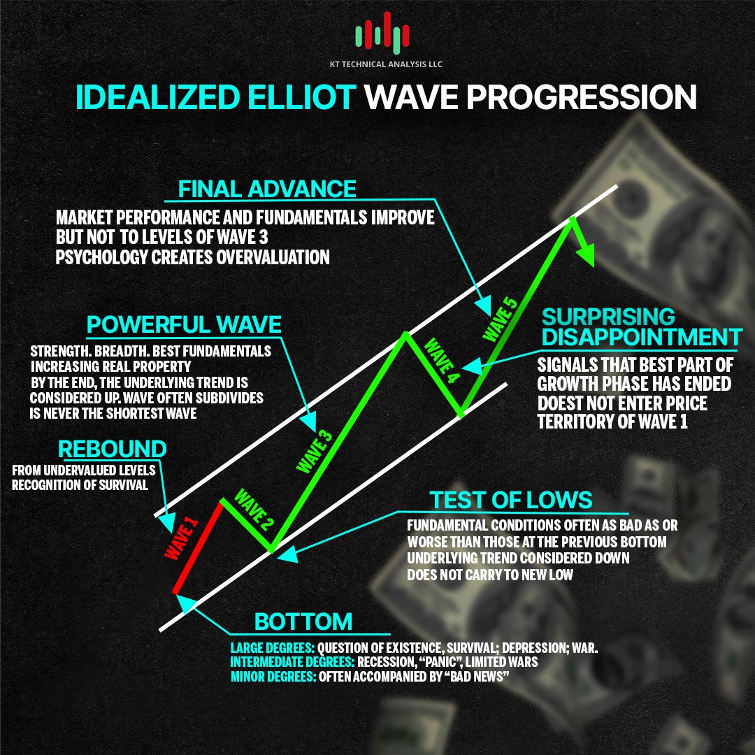 Trading 101: Idealized Elliot Wave Progression This illustration provides a visual representation of the typical structure of an Elliott Wave pattern. Starting with a Bottom, the market enters an Impulse Wave characterized by increasing strength, breadth, and fundamentals.