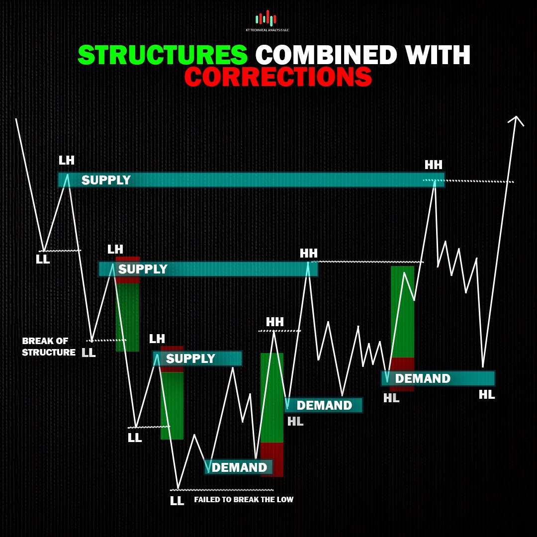 Trading 101: Structures Combined with Corrections💥 This chart illustrates how identifying key supply and demand zones can help you anticipate market movements and capitalize on profitable trading opportunities. 💡 Notice how the price repeatedly tests these zones, creating