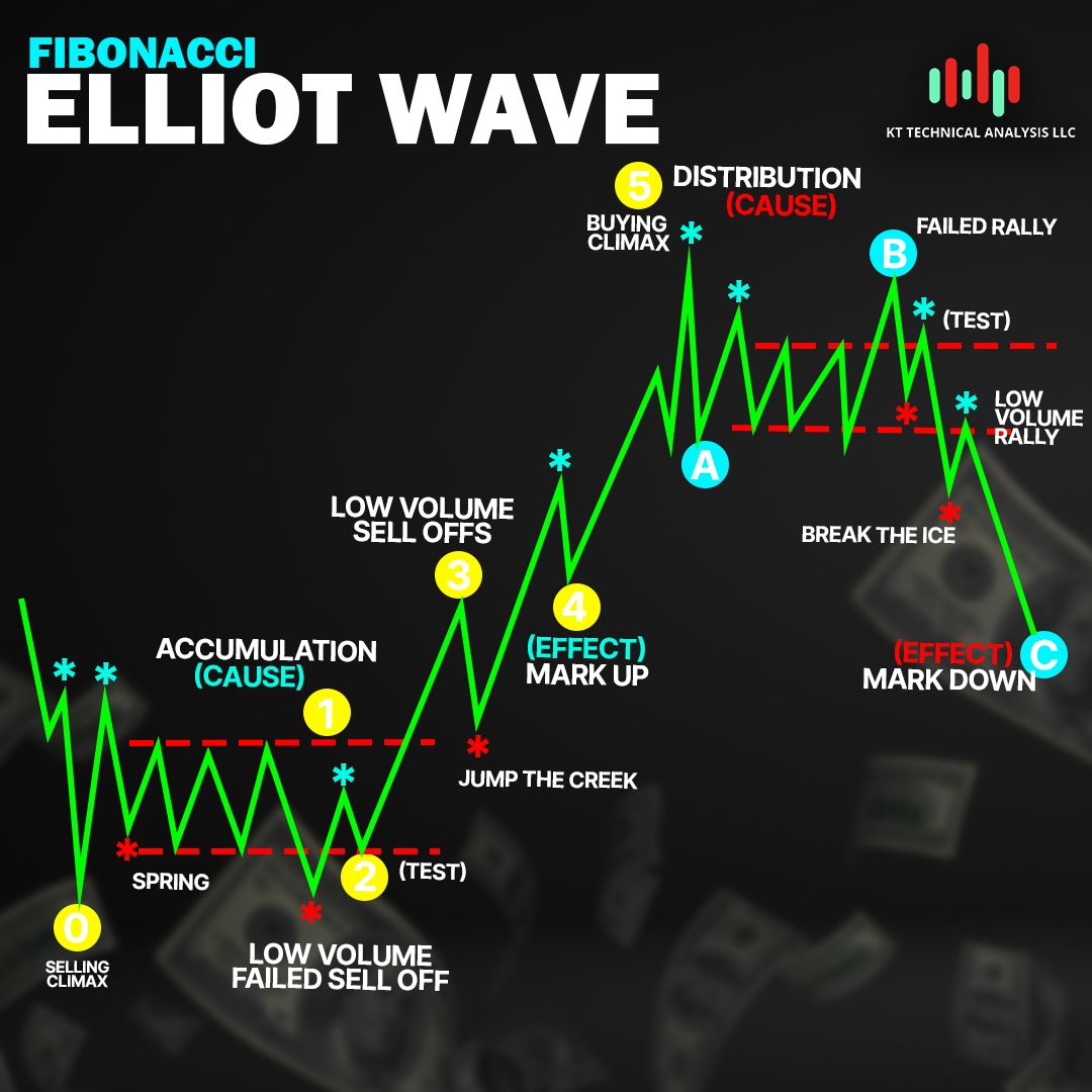 Trading 101: Elliot Wave Fibonacci The Elliott Wave combined with Fibonacci levels illustrates a full market cycle: accumulation, markup, distribution, and markdown. Each phase represents a shift in market sentiment. Starting with accumulation after a selling climax, followed