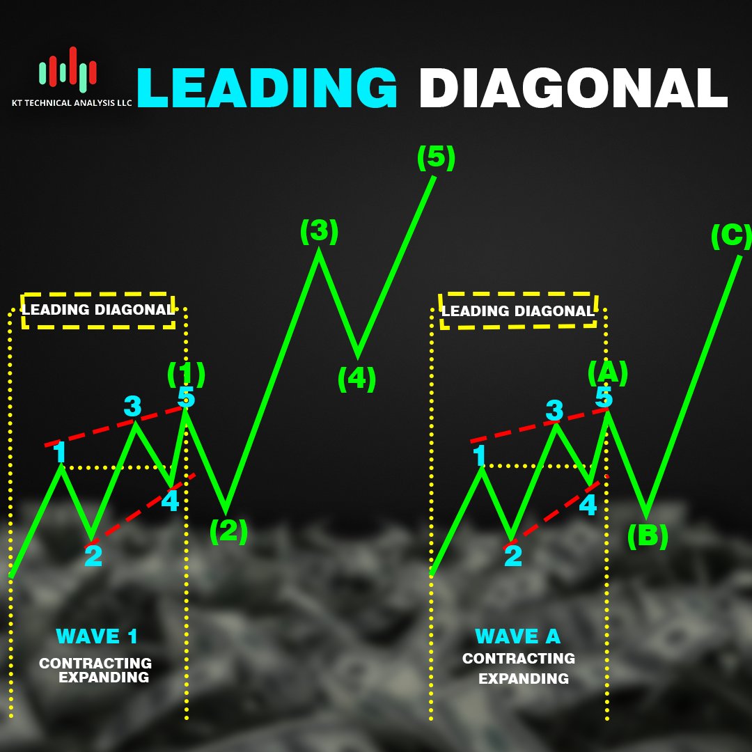 Trading 101: Elliot Wave Diagonal Pattern Leading diagonals are five-wave structures within impulse waves. They contract, meaning waves get smaller. This contraction suggests a potential trend reversal or pause. The image shows a leading diagonal with numbered waves 1-5