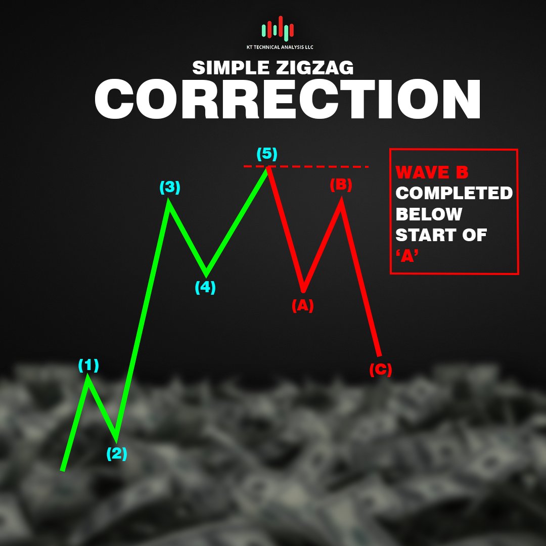 Trading 101: Elliot Wave Simple Zigzag Correction A simple zigzag correction is a basic corrective pattern in Elliott Wave Theory. It consists of three waves labeled A, B, and C. Wave A must always be an impulse wave, meaning it follows a 5-wave structure. Wave B can be any