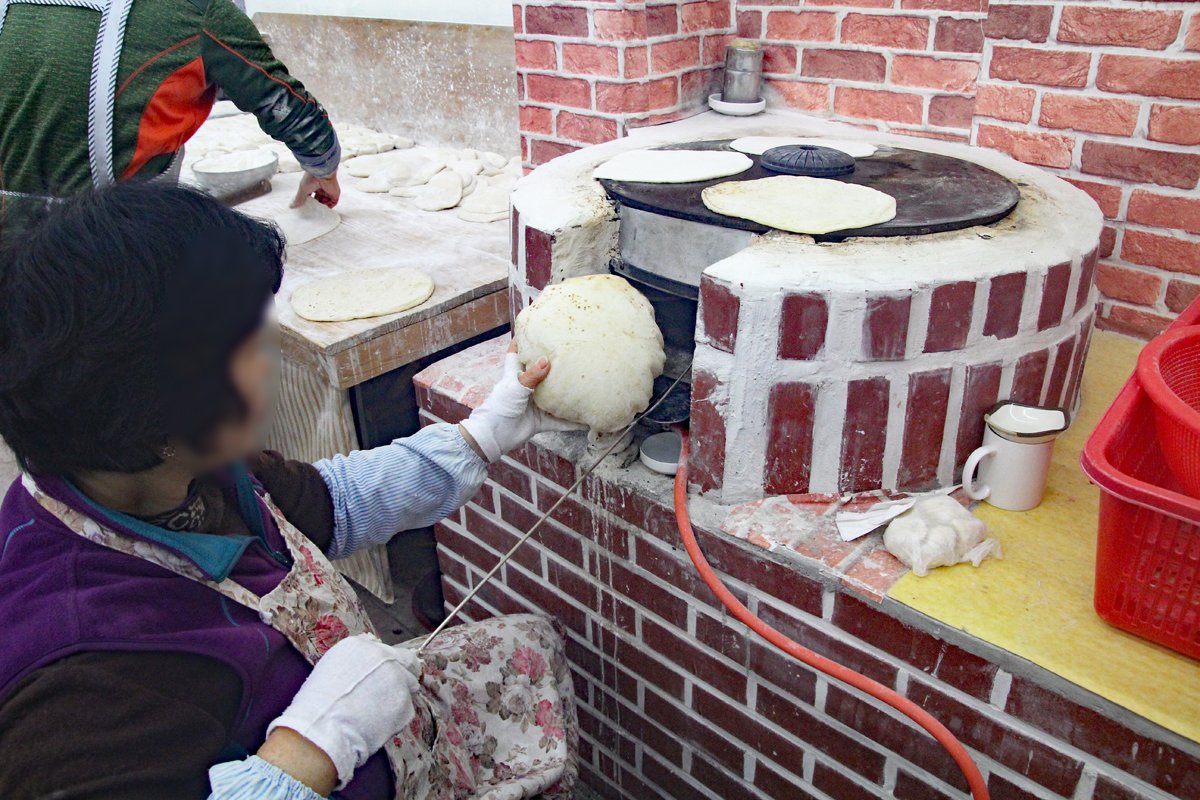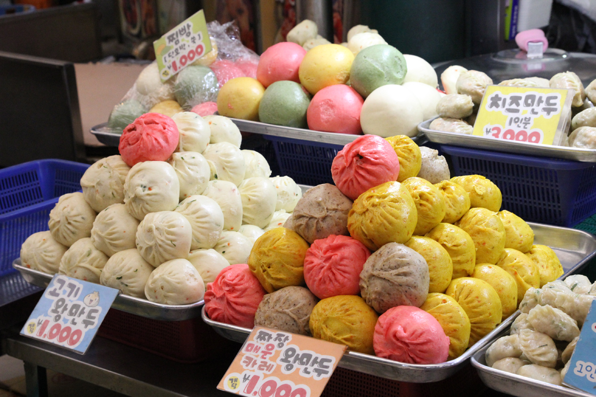 スキットの最後は当初の構想段階でもう2行あって、そこで市場の歴史をスオが解説する予定でした。ただ、そうなると会話のやり取りがちょっと長いので、私のほうで引き取って解説する形にしました。市場内ではほかにも、色とりどりの「왕만두」や、昔ながらの中国式「호떡」を味わうことができます。