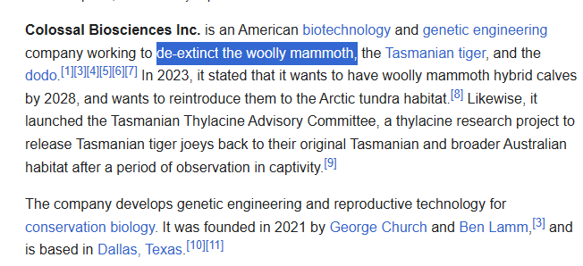 I don't think you all understand that Mammoth revival is not just a fringe pipe-dream. People with lots of money and funding are actively working to get this done. https://en.wikipedia.org/wiki/... https://en.wikipedia.org/wiki/...