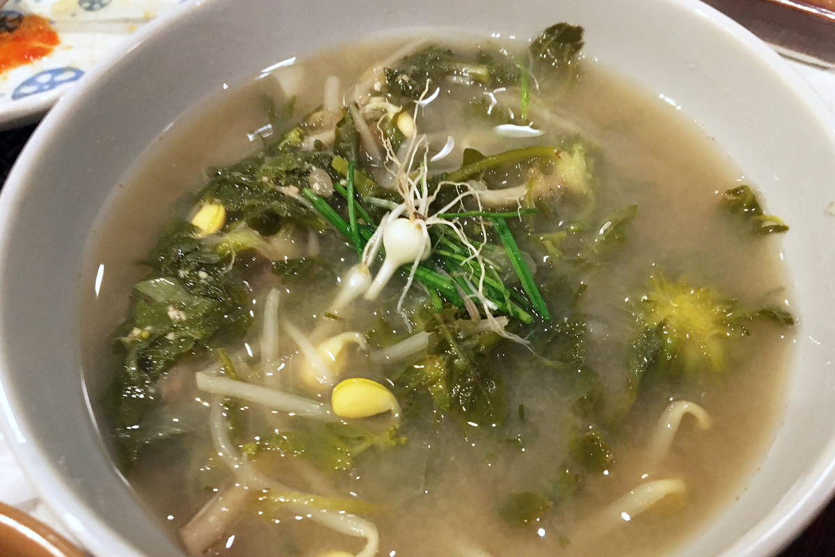 「グルメ探求Q&A」では山菜料理を紹介しました。左上が「냉이무침」、右上が「두릅회」、左下が両方入りの「달래냉이된장찌개」、右下が「더덕구이」です。 ハンナさんは子どもの頃の話をしてくれました。 어릴 적에 엄마가 봄이 되면 반드시 달래된장찌개를 만들어 주셨어요. 추억의 음식이에요.