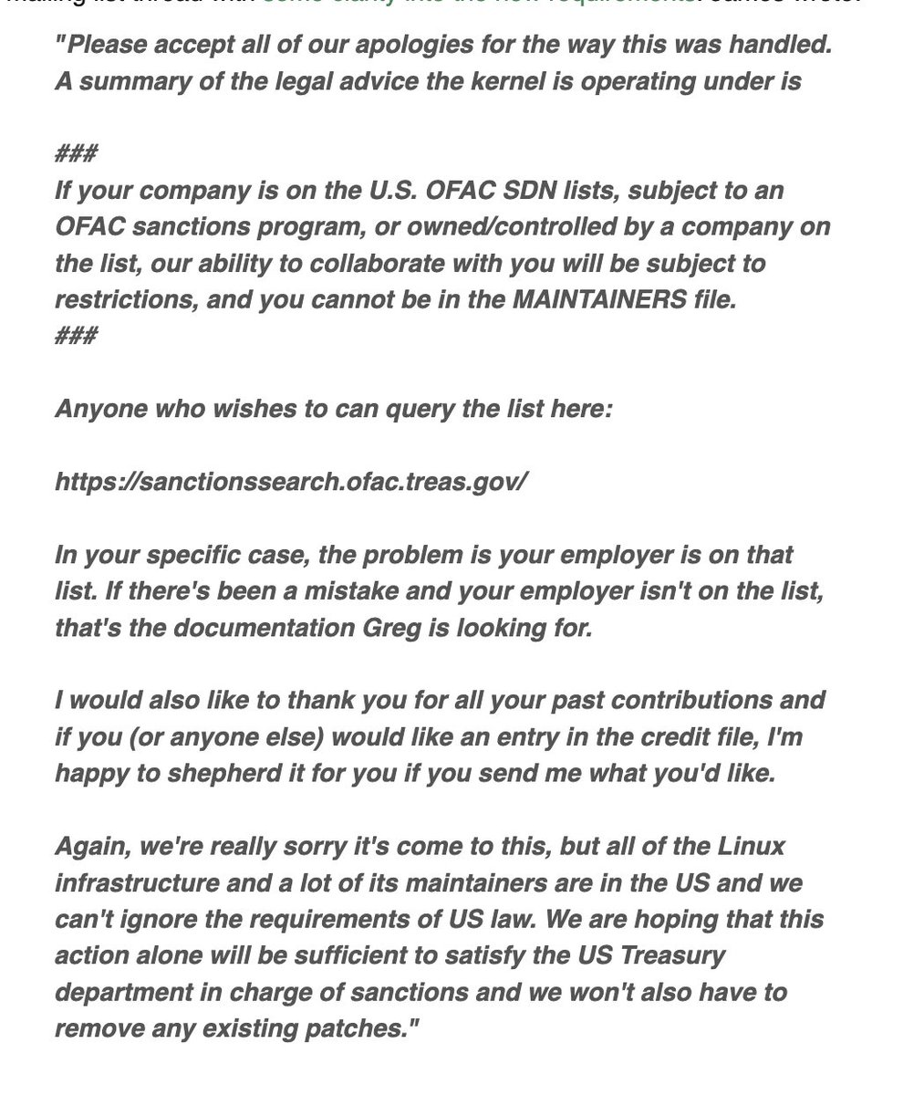 Apparently, you aren't allowed to contribute to FOSS if you were born in a «wrong country». It's a horrific precedent for Linux. Truly sad to see.