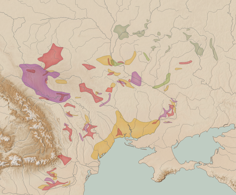 Settlment Areas of Ethnicities of Northern Barbaricum Within Oium, 3rd century AD. Green: Slavic groups of Zarubinets and Kiev Cultures Yellow: Sarmatians and Alans Purple: Vandals of the Pzreworsk Culture Red: Gothic Elites of Oium Part of a much bigger Project