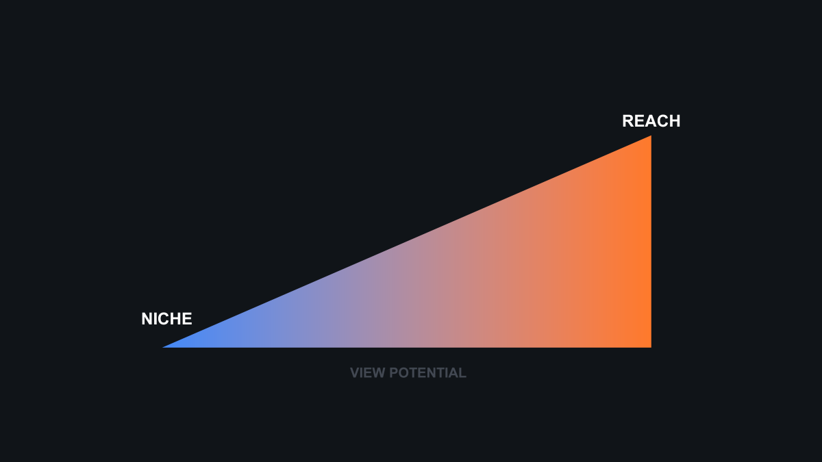 Talking about videos, every piece of content falls somewhere within the following spectrum: - Niche: Requires prior context to spark interest - Reach: No prior context is required to spark interest Most of the time, it’s somewhere in between.