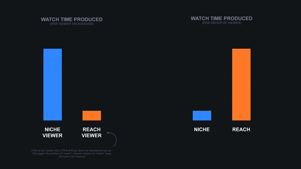 There’s a huge asymmetry in how viewers produce watch time. “Niche viewers” are like the whales in our example, individually they produce more watch time on average than a “reach viewer”.