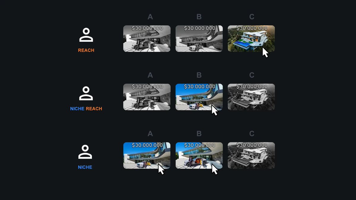 Depending on which thumbnail is recommended, each viewer because of their interests difference, will not act the same: - The NICHE viewer would click on A & B but not C - The NICHE-REACH viewer would click on B but not A & C - The REACH viewer would click on C but not A & B