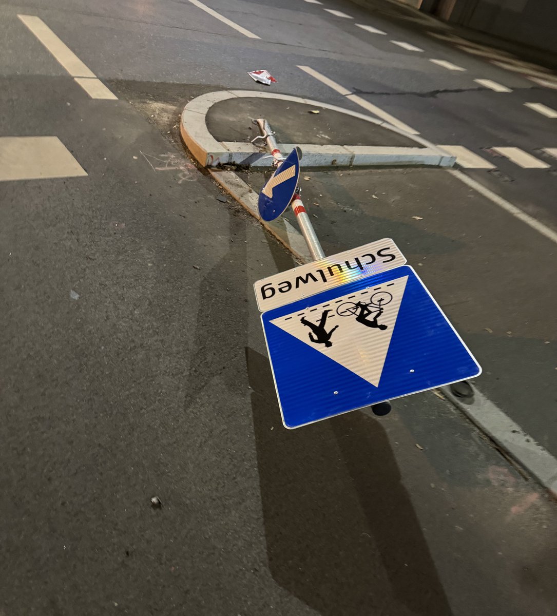 Update: die Stadt hat das Schild wieder aufgerichtet und absolut verkehrssicher befestigt. Das hält jetzt wieder ein paar Tage.