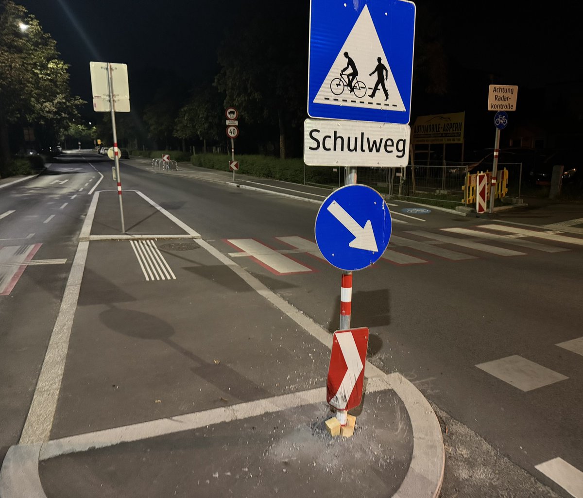 Update: das Schild wurde heute Nacht wieder umgefahren. (Hat jetzt aber doch einige Wochen gehalten)