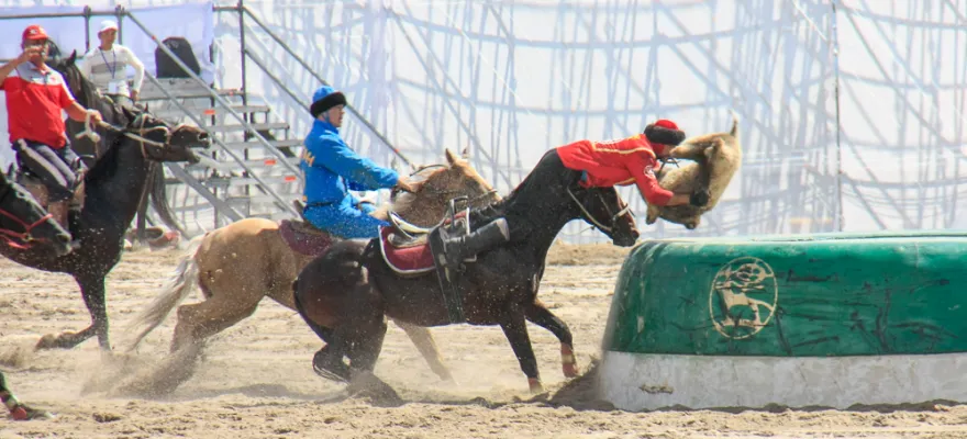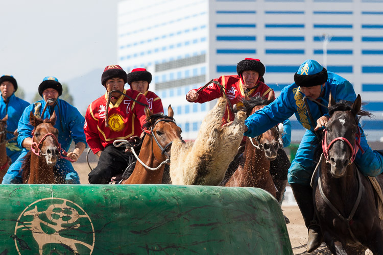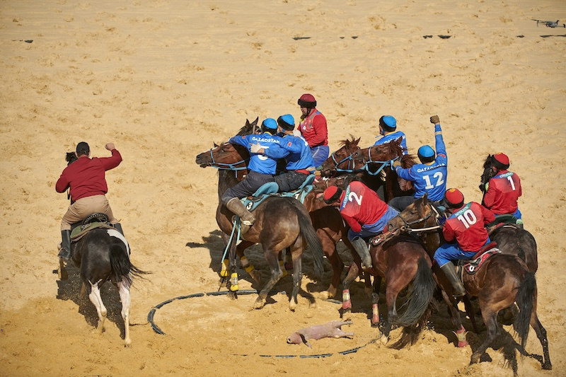 Unlike before, both champions wrestle and whip with a series of such extreme blows that neither makes progress. But then, the Kyrgyz steal the carcass. The leader dashes to the right, and signals to his teammates to fight the defenders. Horses plow into each other and pile up.
