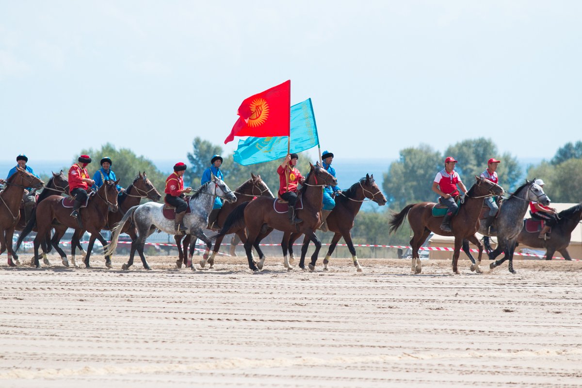 Day 1 features the Turks vs the Kazakhs. The teams of 12 march in two uniform lines that criss-cross in the center, as the crowd chants "Kazakhstan!". The Turks take to the left and the Kazakhs to the right. The sheep carcass is placed on the field and the game begins.