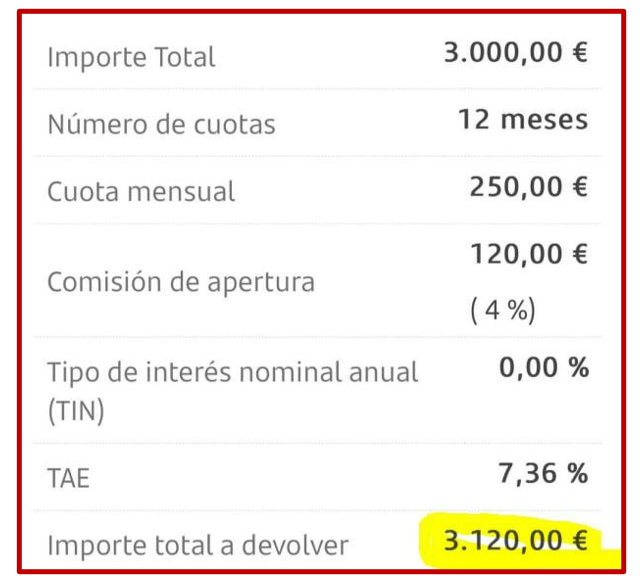 Pero… hay una comisión de apertura de 120 €. Así que aunque el TIN sea 0, el TAE se dispara al 7,36% (según el banco).