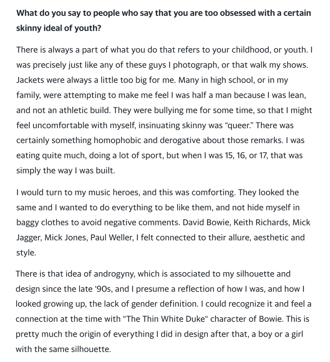 Slimane said as much in a 2015 interview. "Many in high school, or in my family, were attempting to make me feel I was half a man because I was lean... They were bullying me for some time, so that I might feel uncomfortable with myself, insinuating skinny was 'queer.'"