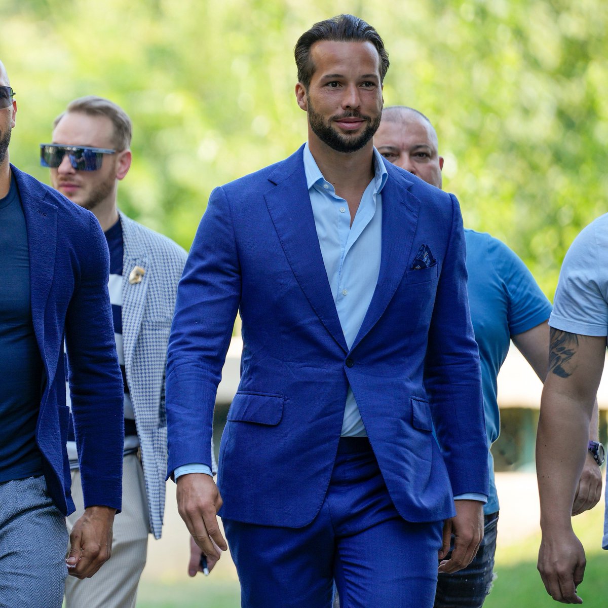Tristan Tate's suits suffer from the same problems. Short jacket, high buttoning point, and low rise pants make his hips look wider than his shoulders. Very "Birth of Venus" silhouette.
