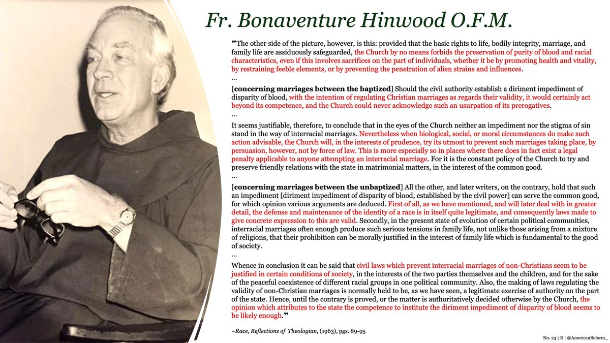 “…the Church by no means forbids the preservation of purity of blood and racial characteristics, even if this involves sacrifices on the part of individuals, whether it be by promoting health and vitality, by restraining feeble elements, or by preventing the penetration of alien