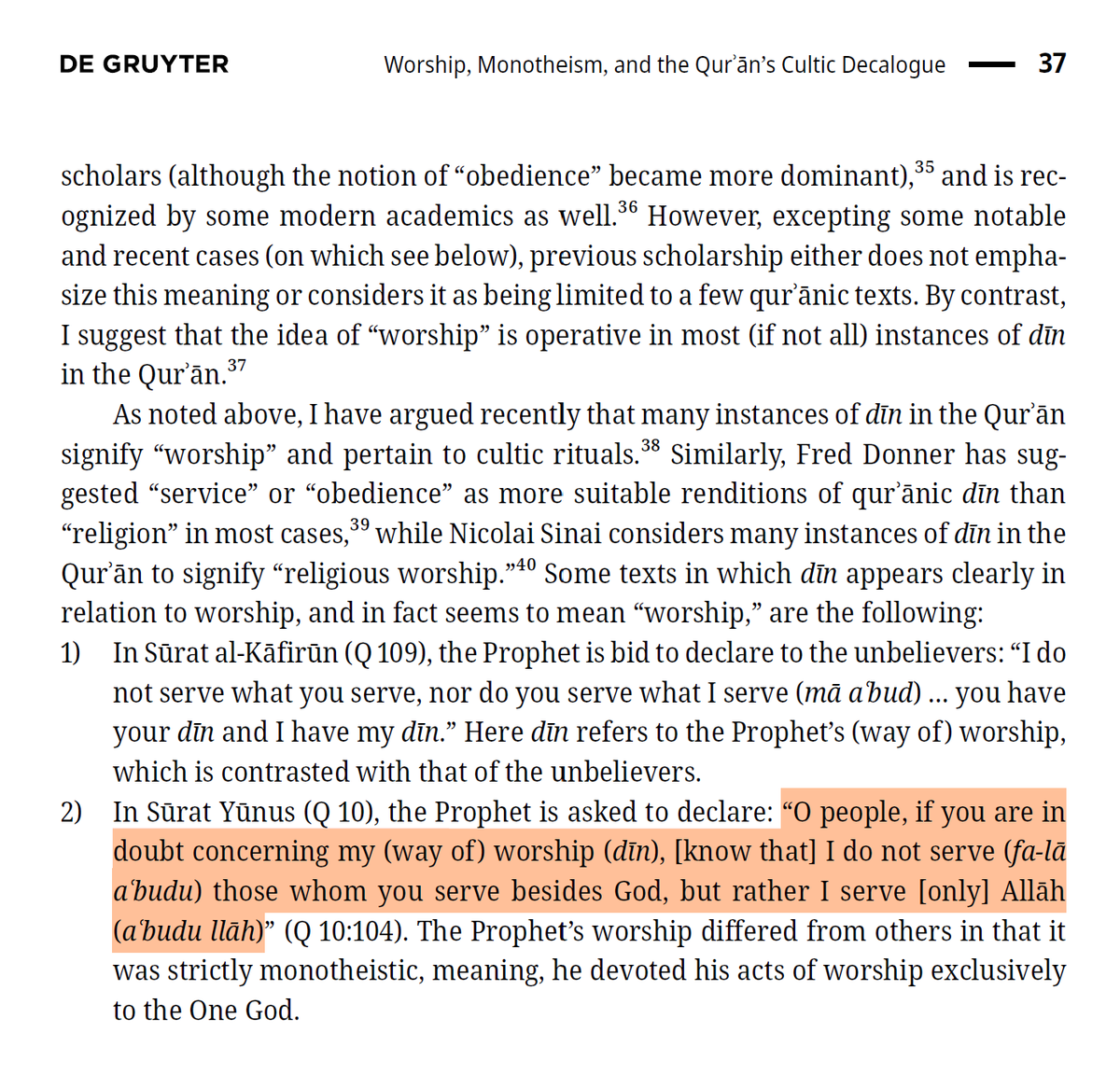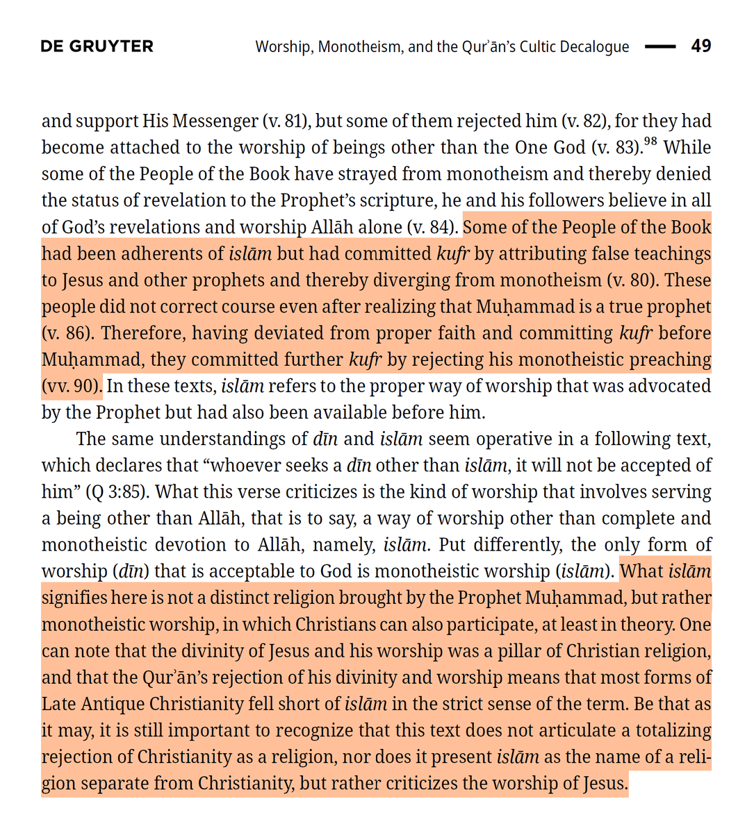 1/11 Is islām ever the name of a distinct religion in the Qur’an? Those who think so often cite the following: “dīn with God is islām” (Q 3:19) “whoever seeks a dīn other than islām, it will not be accepted of him” (Q 3:85) But I think these texts simply insist on monotheism.