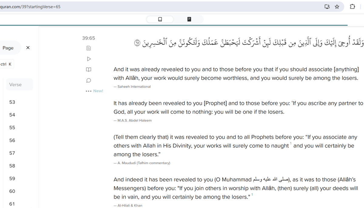 8/11 The notion that non-monotheistic worship is unacceptable also occurs in several other verses, for instance, in Q 39:65 (which also has a similar ending to Q 3:85).