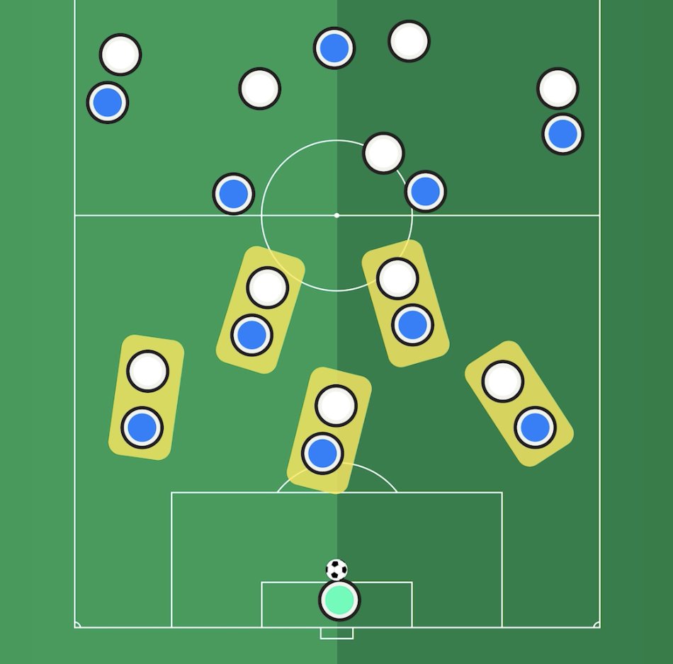 However, they tend to defend in a different shape so they have to arrive at the box midfield in a different way. They have lots of different options for this and the half time shift actually involved a different way of forming the box.