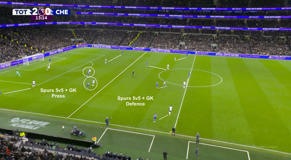 This now meant that Chelsea technically had a +2 advantage in build up against the Spurs 5-men pressing unit, which reduced the pressure that Chelsea were under as they worked the ball from the back.