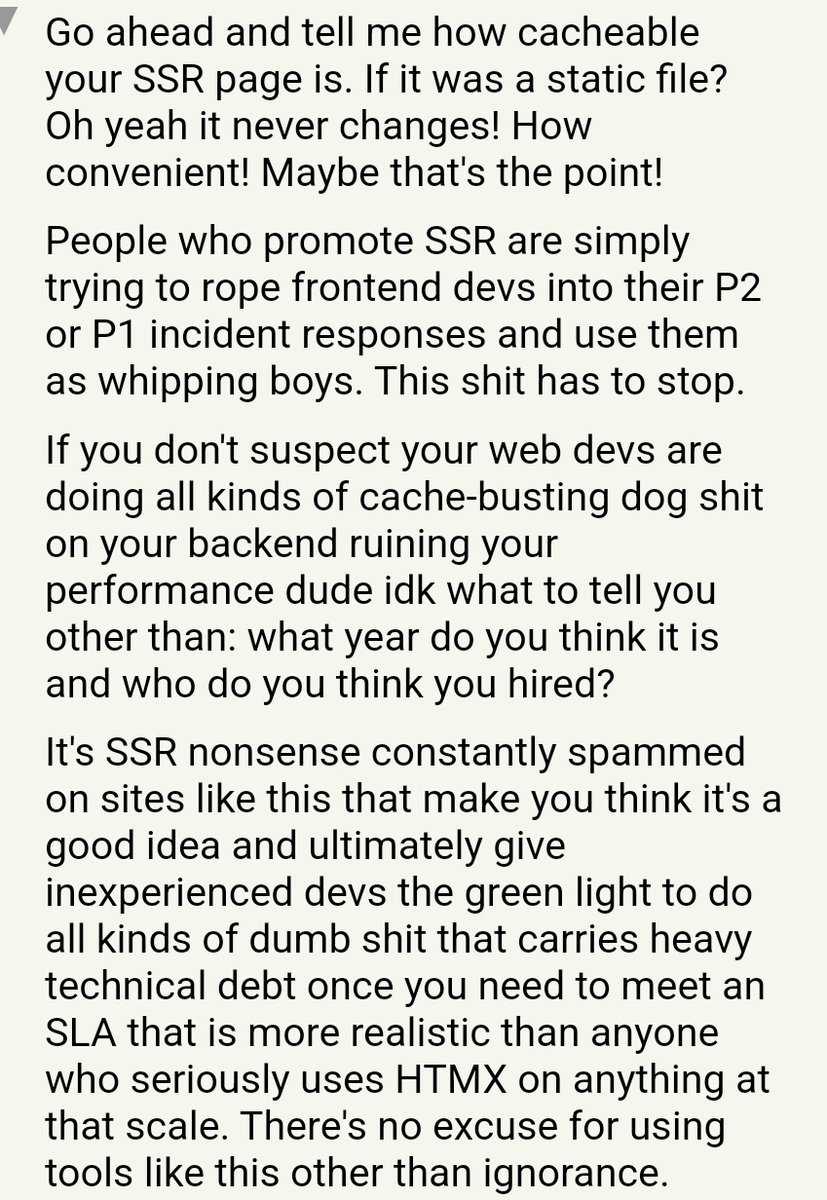 "Server rendering is stupid. It's only there to increase bills by cloud providers" Increasingly tired of seeing this sentiment so I'm going to explain why this is a really dumb take. 1. SSR costs are low The cost of turning JSON into HTML is not particularly large. Most SSR