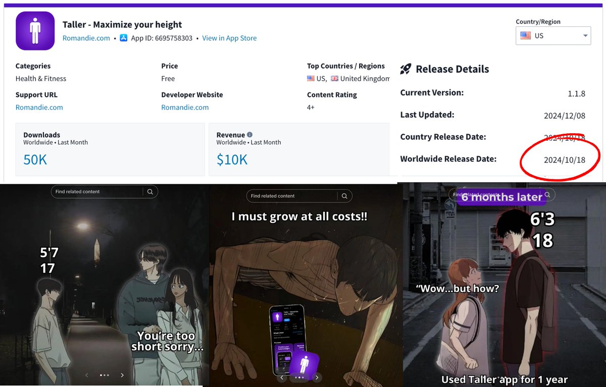 After LooksMaxxing: 2-month-old app Taller is repeating scheme with vertical HeightMaxxing. Already at $10K+ MRR & 50K downloads. Here’s how they pulled it off with TikTok marketing 🧵