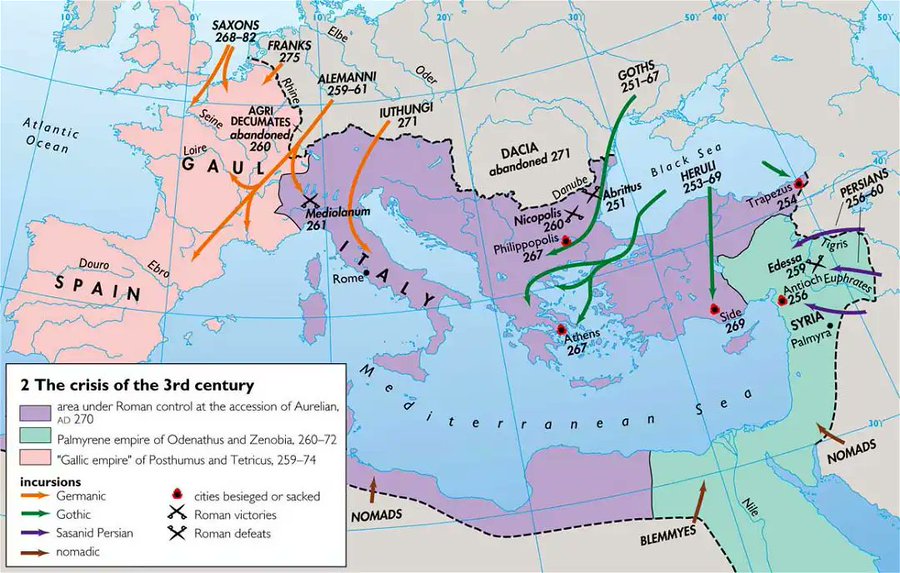 El declive demográfico se vio agravado por las guerras y plagas de la crisis del siglo III. Al cesar la expansión exterior del Imperio y disminuir su población libre, los emperadores se vieron obligados a importar cada vez más bárbaros para sostener sus ejércitos.