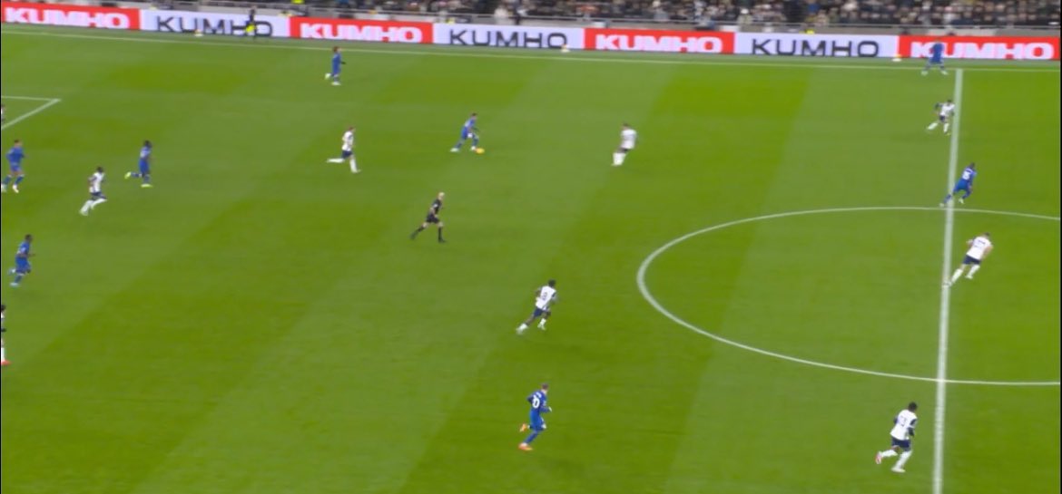 And the reason their centre backs weren’t comfortable in doing this was because if they did push up extremely high, Chelsea could go long as there’d be a 3v3 at the back with lots of space between the fullback & centre back Further up the field we had a 5v4 against their defence