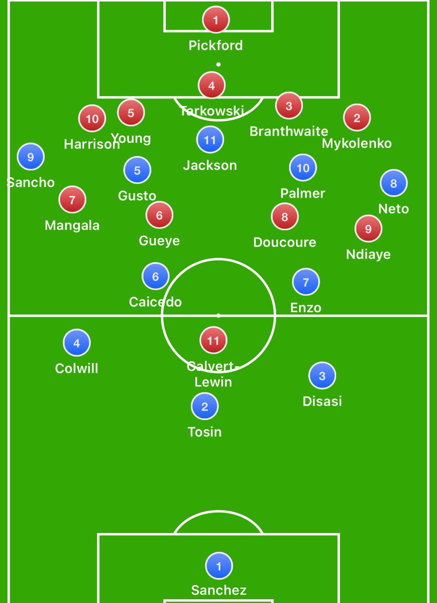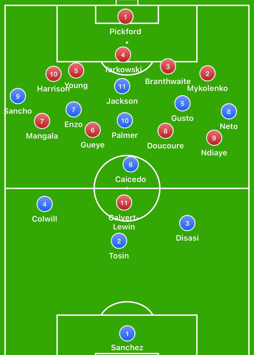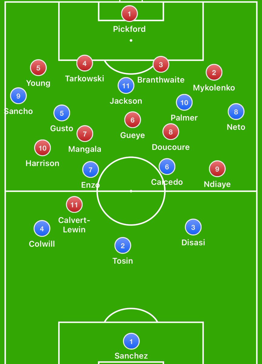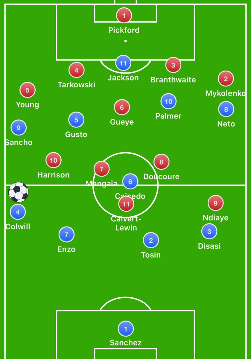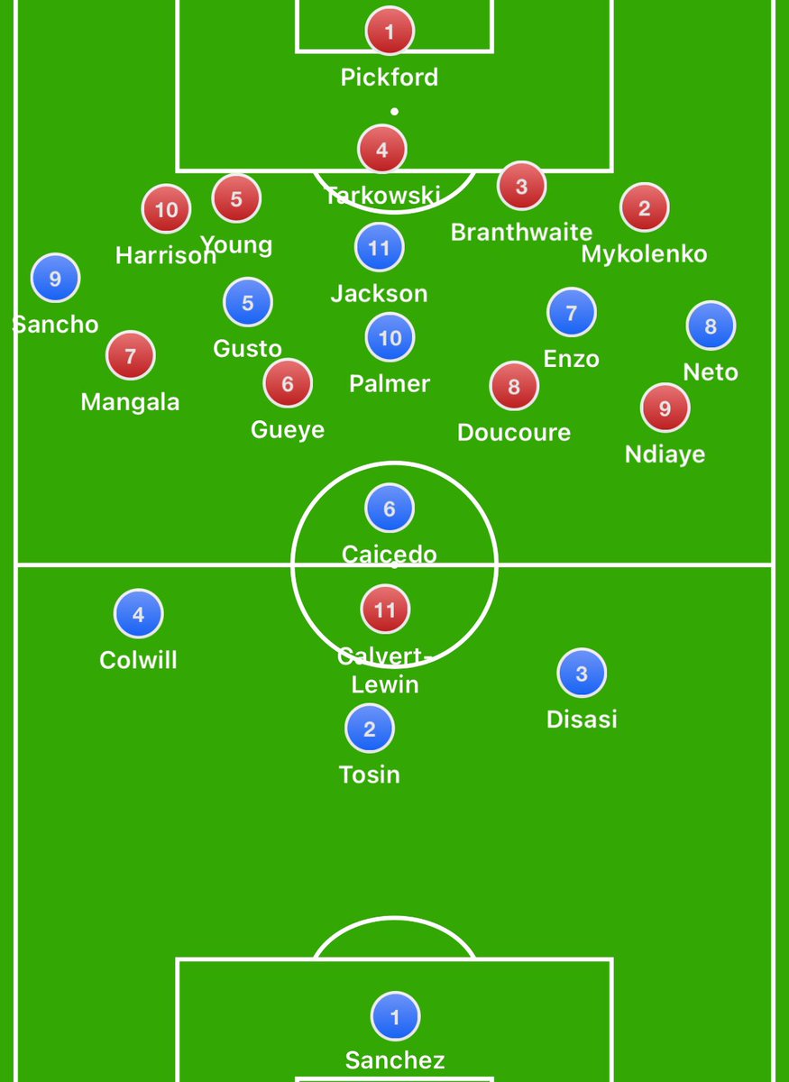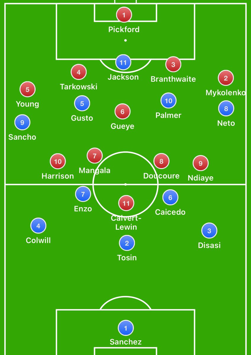 I think he should’ve asked one of the deeper players to move higher up to form a diamond shape once we pinned Everton back by either moving Enzo to the right of the double pivot OR moving Gusto to right back Let me explain why