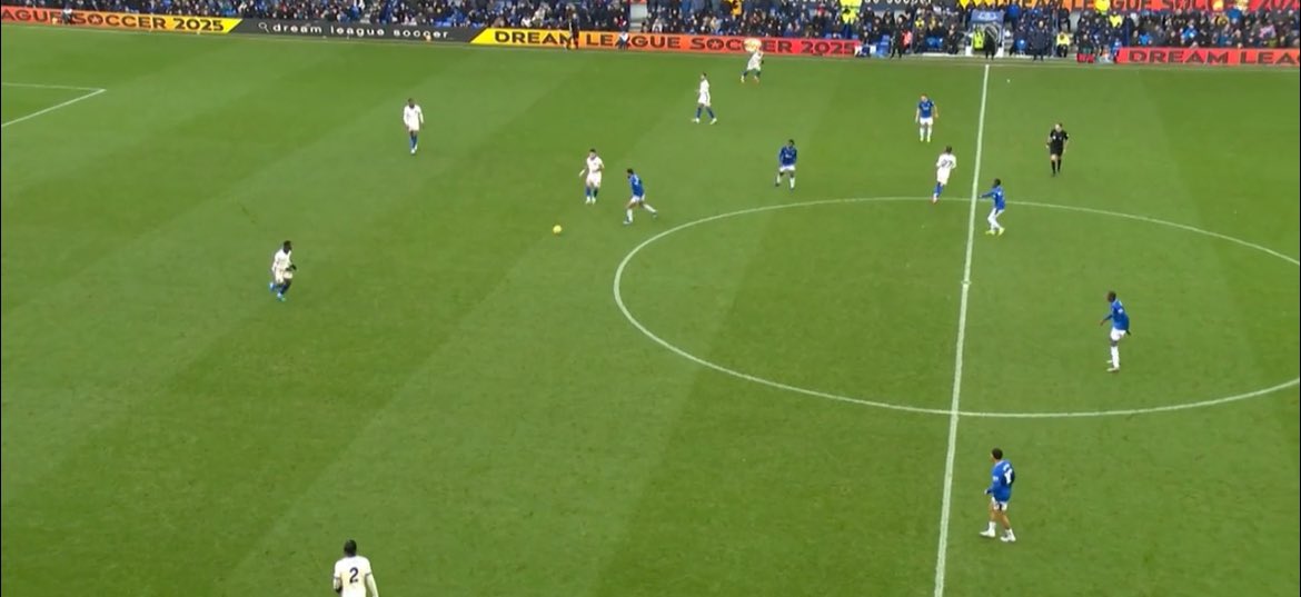 The 2nd issue was they didn’t always get the timings of when to move from a 4-1-4-1 to a 5-4-1 right Here Doucoure stays as a lone 6 rather than stepping up so Gueye can’t move across, that leaves Colwill in acres of space, Mangala presses him but Enzo is free, leads to a corner