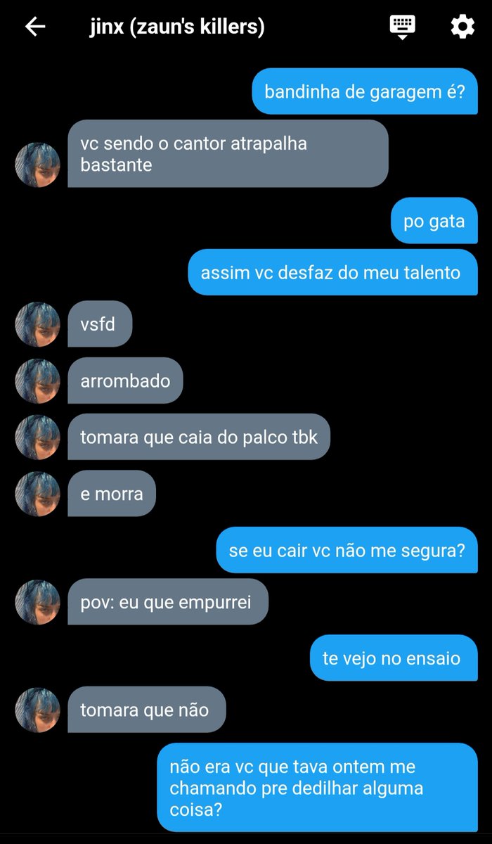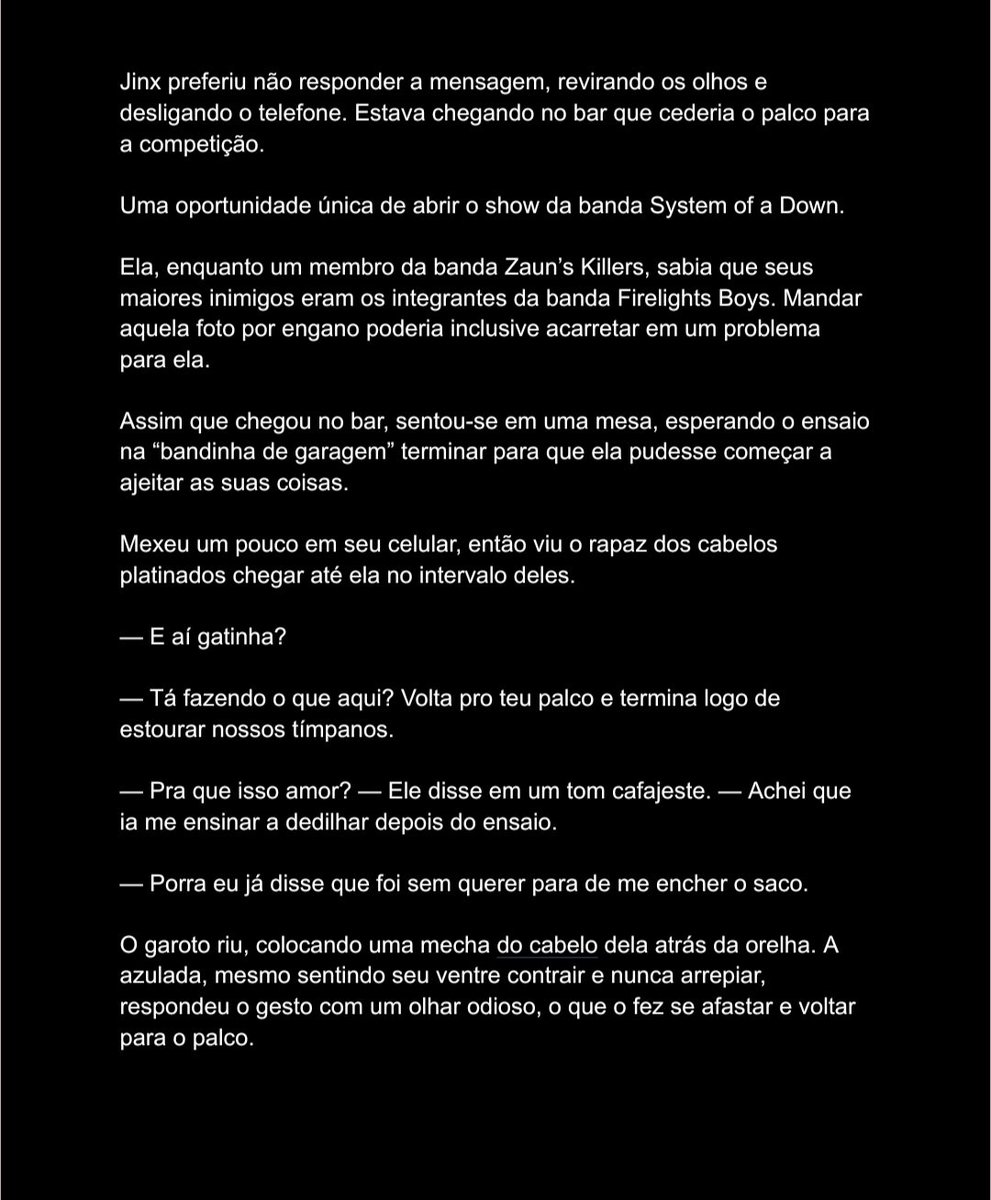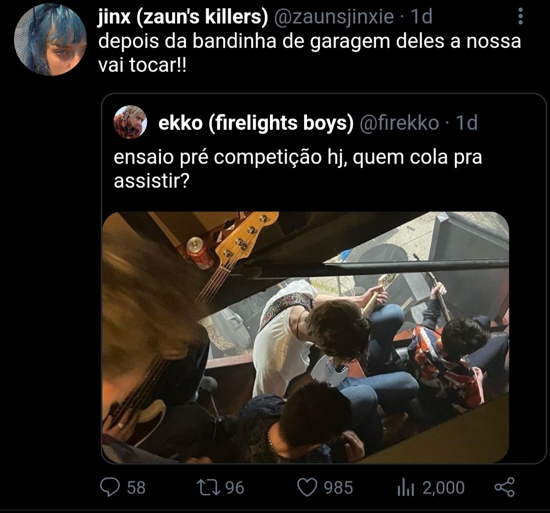 #timebomb au Jinx é guitarrista de uma banda e decide mandar uma foto sexy para um cara que tá conversando, mas sem querer manda para Ekko, o vocalista da banda rival da sua Eles vão conseguir participar da competição sendo que Ekko só pensa nas curvas da azulada?