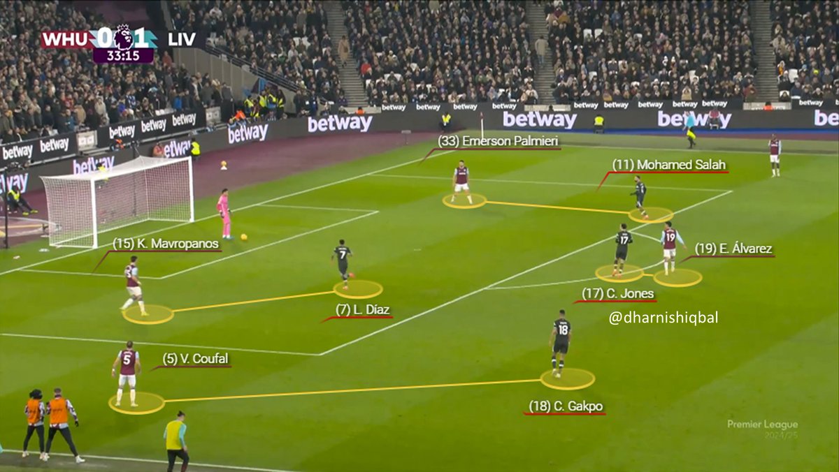 This was how the 2nd goal was scored, as Diaz pulled a man wide and Jones dragged a West Ham defender almost into his own half. It felt as though Liverpool were encouraged to quickly play it in behind with them being much faster than West Ham's back line
