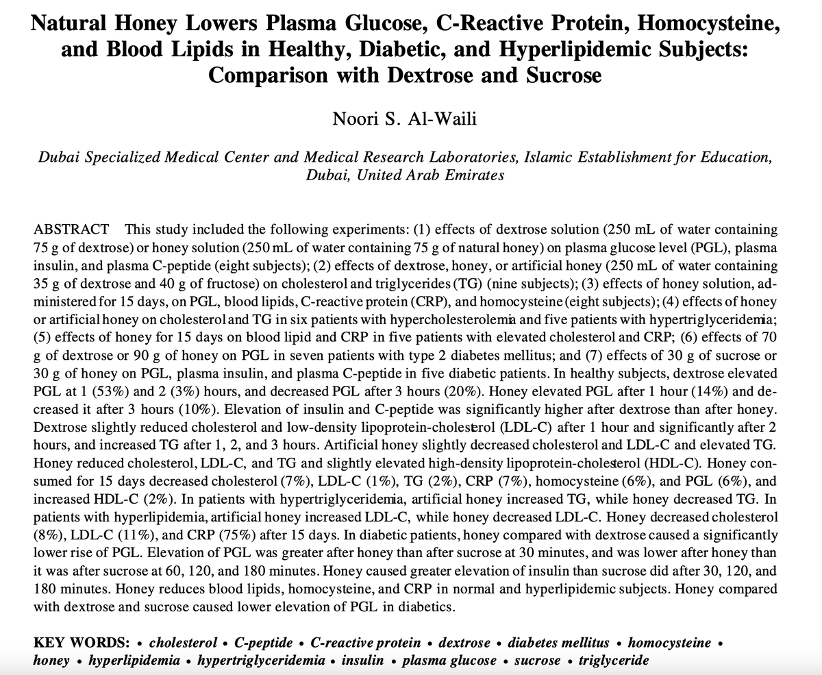 One study showed swapping 70g of sugar for raw honey: ☆ Sheds fat ☆ Lowers blood sugar ☆ Cuts triglycerides ☆ Dampens inflammation (CRP) Yes, honey is more than "just sugar." Far more, in fact.