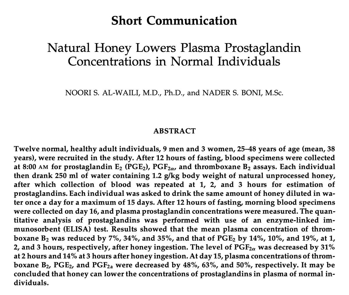 Raw honey rapidly lowers inflammation. Within HOURS of consumption, the levels of prostaglandins (inflammatory compounds) drop in response to raw honey. That's a lot of honey too, ~70-100g.