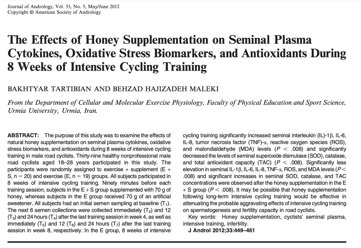Raw honey improves male fertility. Chronic exhaustive exercise can: • Worsen sperm quality • Lower sperm count • Induce seminal inflammation + oxidative stress yet, consuming HONEY with it blunts these effects.