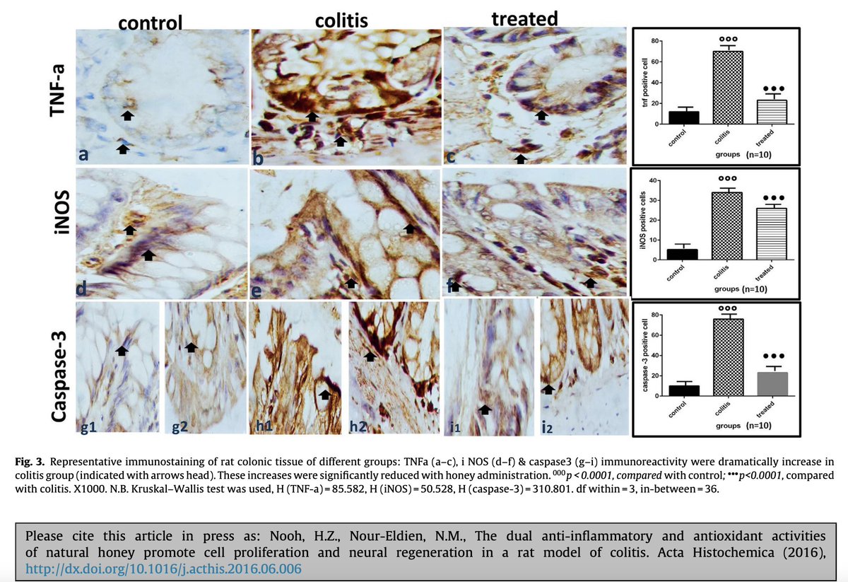 In fact, raw honey can even slow down inflammatory bowel disease progression. Here, raw honey reduced the amounts of inflammatory mediators: ◇ TNFα ◇ Nitric oxide while reducing cell death in the colon. A GREAT option for people with gut issues.