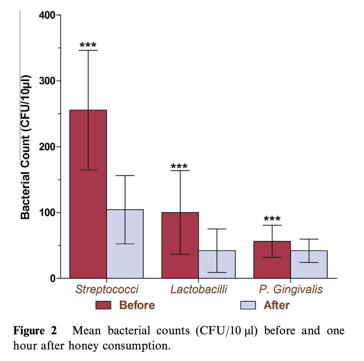 Raw honey markedly effective against cavity causing bacteria. Acid producing bacteria, the culprit behind tooth decay: ☻ Strep Mutans ☻ Lactobacillus were cut by more than HALF after consumption of raw honey. The gingivitis causing bacteria, P. Gingivalis did as well.