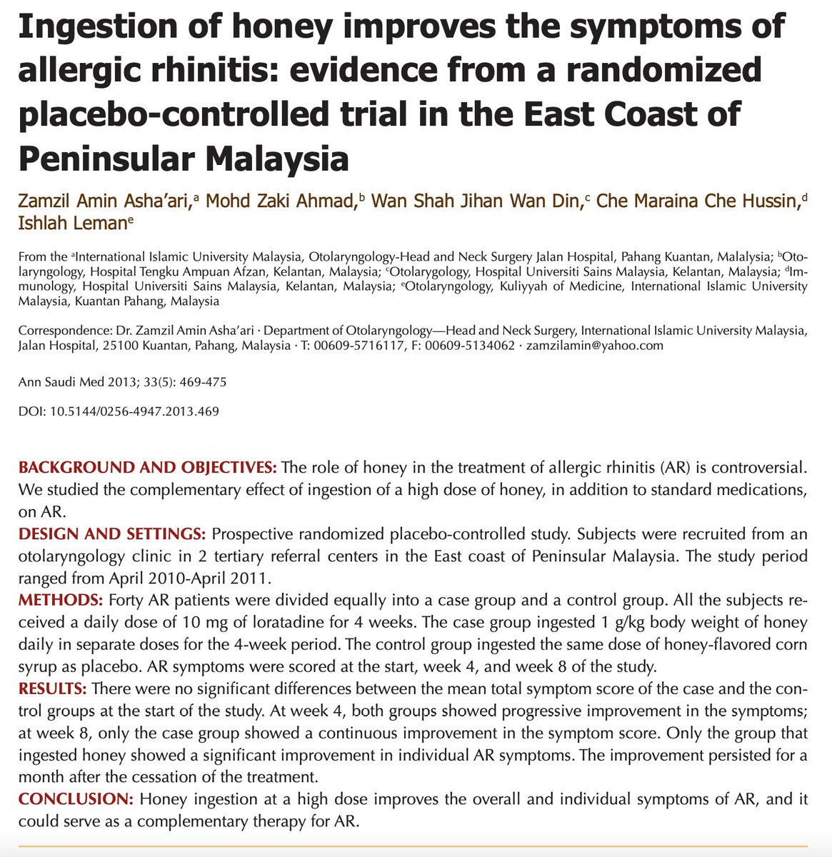 Raw honey improves allergies. 3-5 tsp of honey / day improved sniffles, sneezing, & more Raw honey has tons of bioactive compounds that: ‣ Inhibit mast cell histamine release ‣ Blunt inappropriate IgE responses ‣ Lowers production of inflammatory cytokines