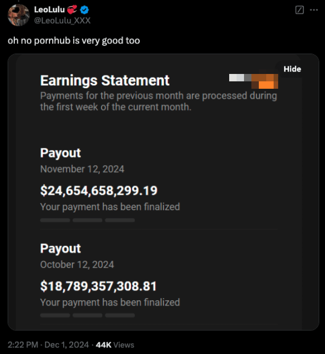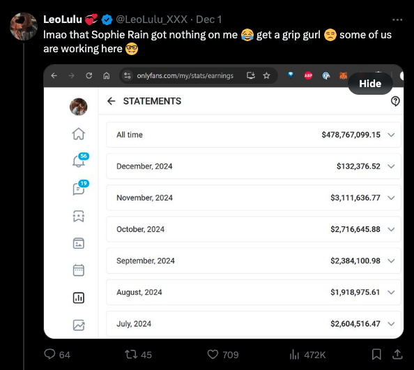 This is freaking WILD! LeoLulu, a couple who's been posting adult content since 2017, has made $478M from OnlyFans — and just last month, they racked in over $24M from pHub. They own it all themselves. No pimps or nasty middlemen. Perhaps we're in the wrong line of business.