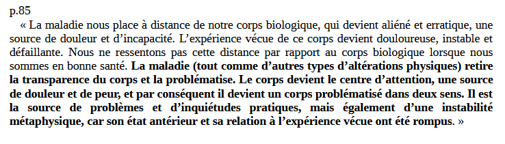 1. La maladie le cri de la chair. Havi Carel. Ouvrage phénoménologique sur la maladie très utile pour apposer des concepts sur l'expérience vécue des malades. Peu convaincue par les derniers chapitres sur la mort et la greffe d'organes mais tout de même très intéressant!
