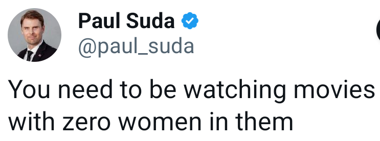 Anti-woke trad values - Movies with zero women are good - Women should only be in bacon cheeseburger ads