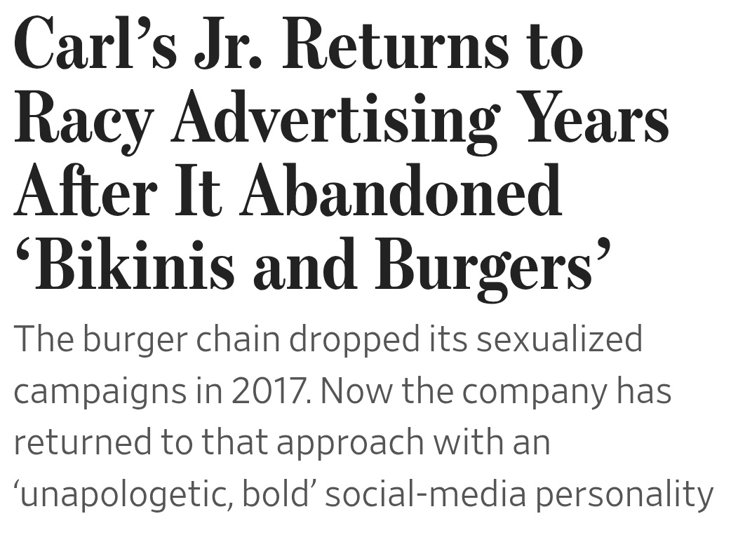Carl’s Jr. began its shift away from its racy ads in 2017, saying the strategy was distracting from the chain’s food 2017: “Carl’s Jr. and Hardee’s have become synonymous with two things: bikinis and burgers. That made it difficult to tell a broader story about menu quality”