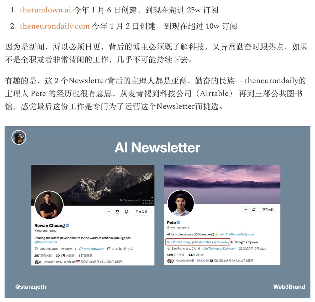 12/ 项目杠杆案例 在Crypto x AI赛道里, @gkisokay 每天总结 @virtuals_io 的更新, @0xwitchy 每周总结 @ai16zdao 的进展,很容易获得官号和社区的转推,3 个月内从1000粉到了近10000粉 行业杠杆案例 2023年最大的势能就是AI了。下图里面的2位,都是在年初开启了AI日报,到了几十万的量级