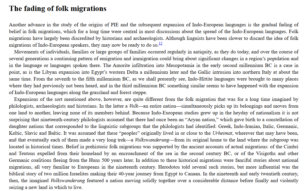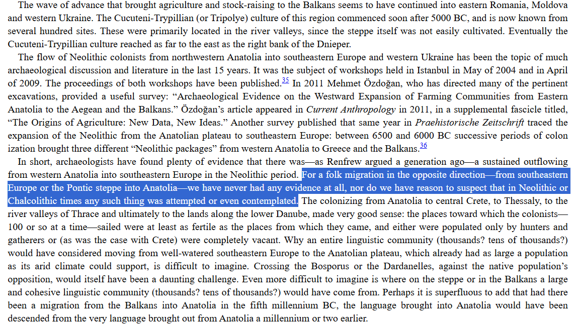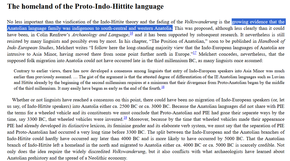 A very problematic excerpt from Drews. Not only do we have evidence of a migration into Anatolia now, from the Reich lab (Lazaridis et al 2025, “The Genetic Origin of the Indo-Europeans”), but even prior to this there were many issues. Mallory lays out that linguists and